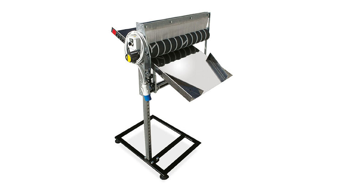 Aufbau | Grundgestell aus einer robusten Rahmenkonstruktion aus Stahlprofilrohr mit Höhenverstellung gegenläufige Separierwalze mit Spiralschikanen zum seitlichen Abtransport feststehend mit 4 Füßen |